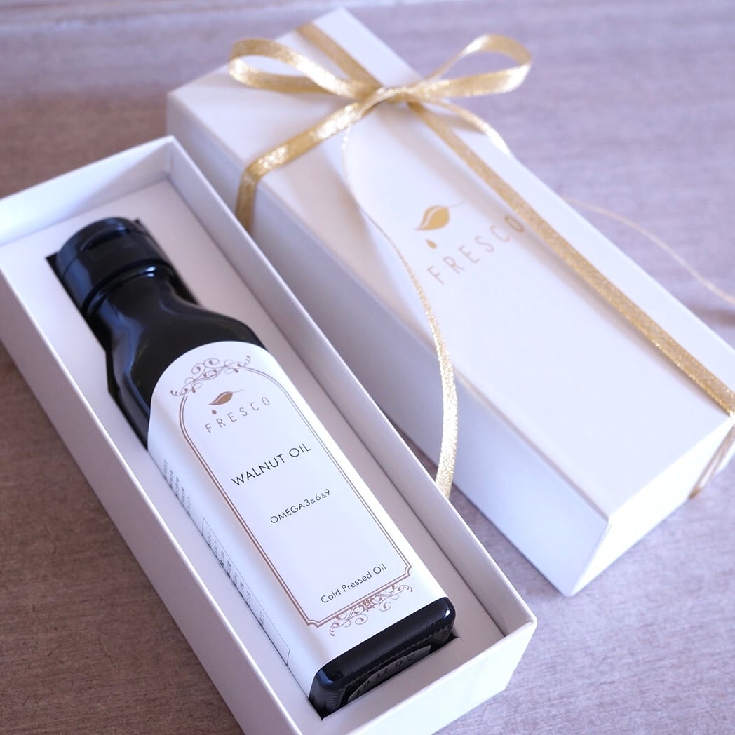 お中元やお歳暮など季節のご挨拶の贈り物として、お世話になっている方、親しい方へのご挨拶ギフトとして、様々なシーンでFRESCOのオイルを贈られる時に、こちらのギフトBOXをご利用ください。ホワイトのBOXにゴールドの箔押しでとても高級感のあるギフトBOXです。
